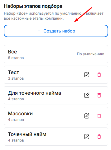 В области Наборы этапов подбора, вы можете настроить список этапов, чтобы потом выбрать его для вакансии. Чтобы у вакансии были доступны не все кастомные этапы, а только необходимые