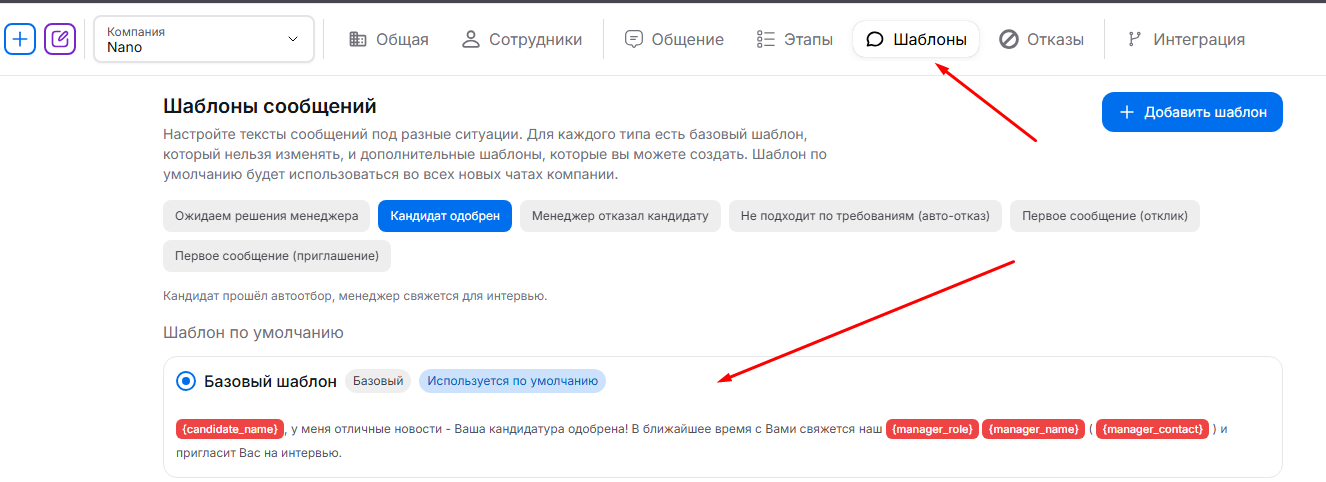 Из AI-этапов, когда с кандидатом общается AI, можно переводить в любые кастомные этапы, а также в служебные статусы «Связаться», «Игнор», «Отказ».