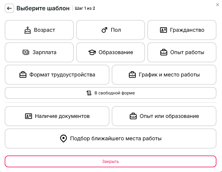 Зарплата/Формат трудоустройства/График работы (шаблоны)— «Зарплатные ожидания до X рублей», «В условиях вакансии указать график работы и способ оформления».