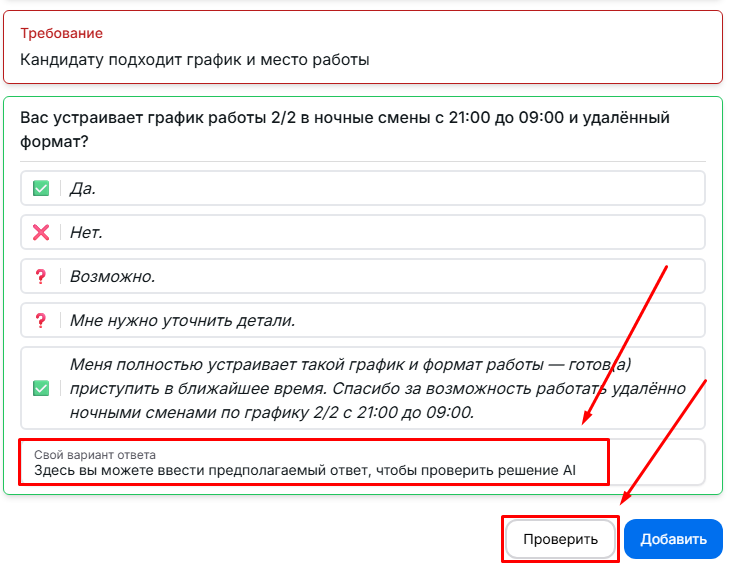 Отдельно отметим, что при использовании шаблонов вы можете сразу проверить, какие ответы AI примет за верные, а какие отсеет.