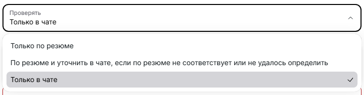 У каждого требования есть Строгость и Тип проверки — они влияют на то, как AI будет проверять кандидата и его резюме, а также какое решение примет.
