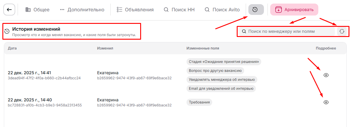 Здесь вы можете увидеть кто и когда менял вакансию, и какие поля были затронуты.